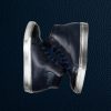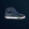 Feast your eyes on a High Top sneaker with a retro style that draws inspiration from the sport of boxing. A padded circled logo placed on the side and genuine Italian leather drapes the upper portion. A silver chrome rubber sole and navy blue cotton laces secure your feet in durability.